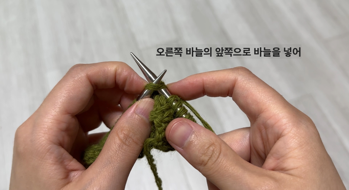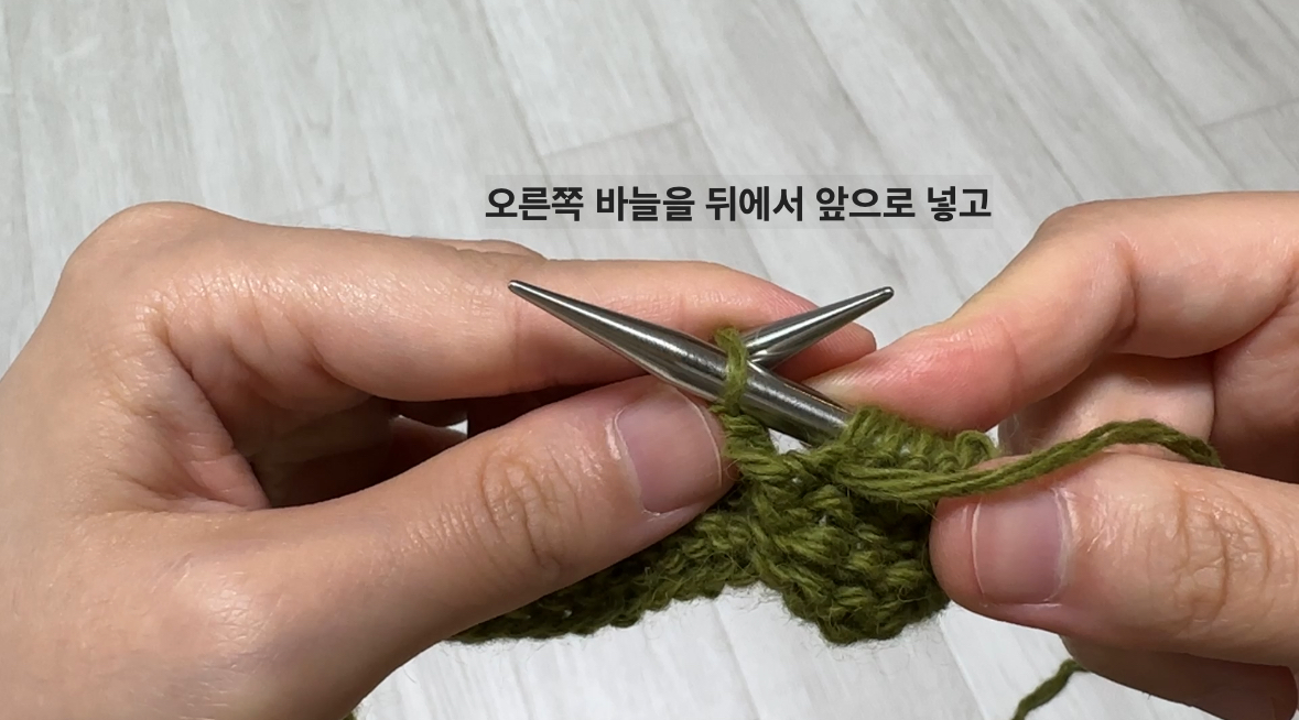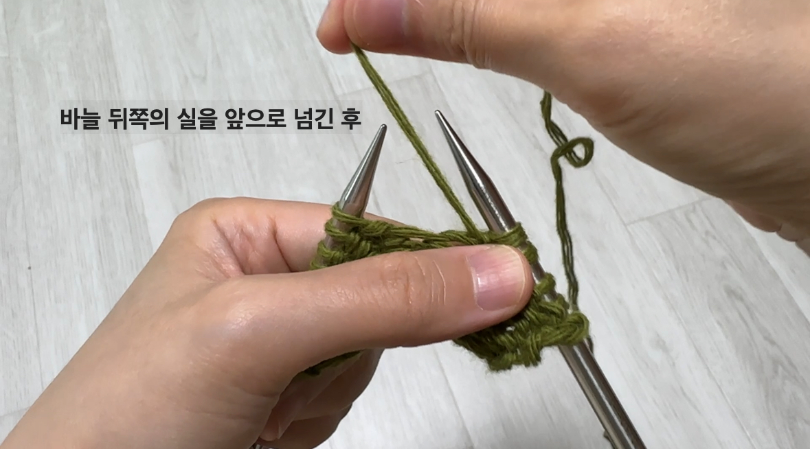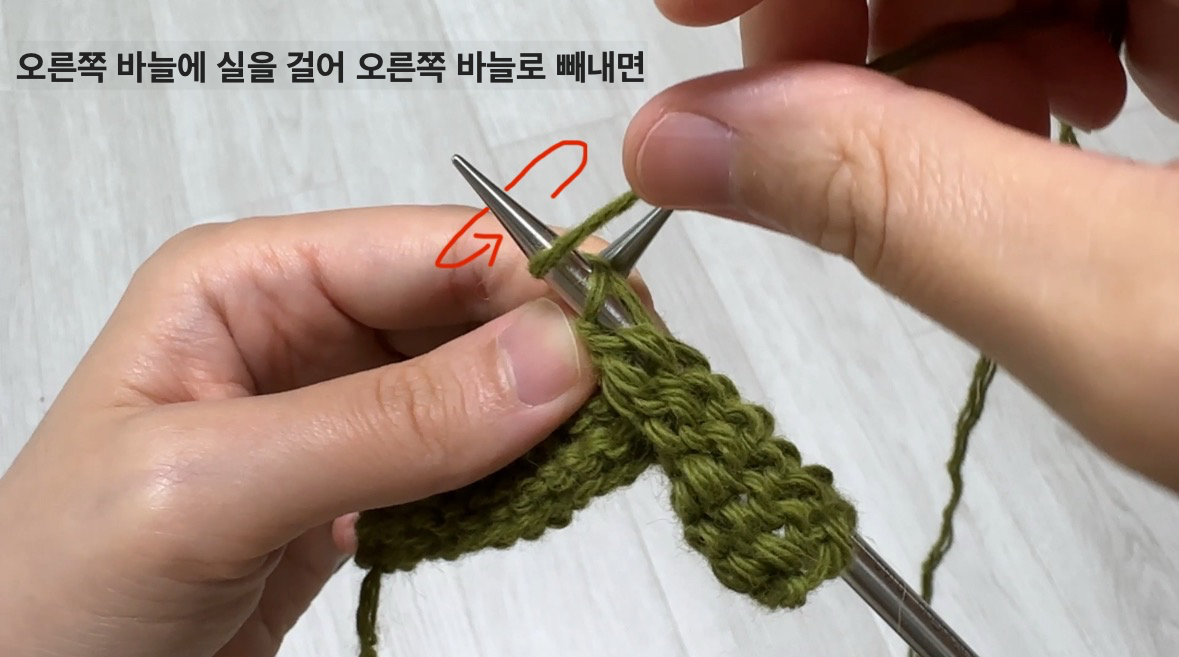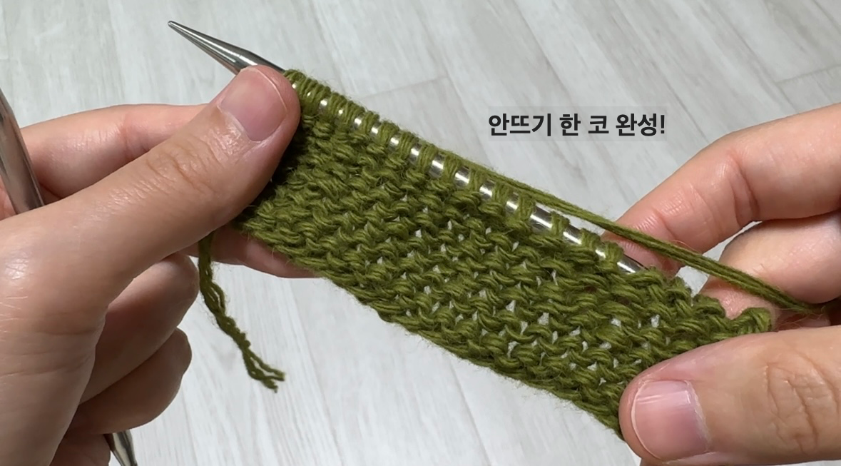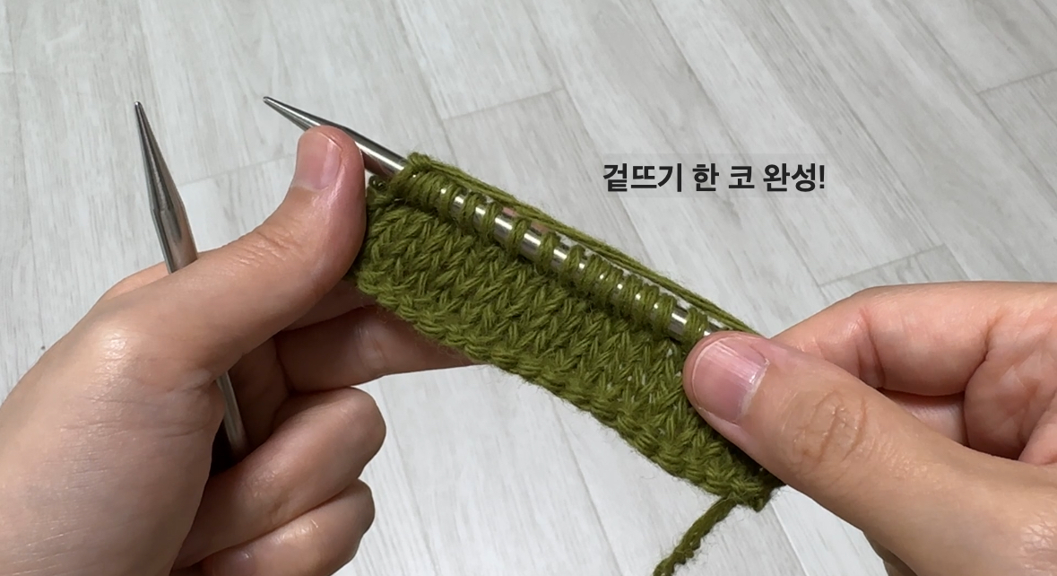 - 방법 : 바늘을 앞에서 뒤로 넣고, 실을 걸어 빼내면 겉뜨기 한 코 완성입니다.