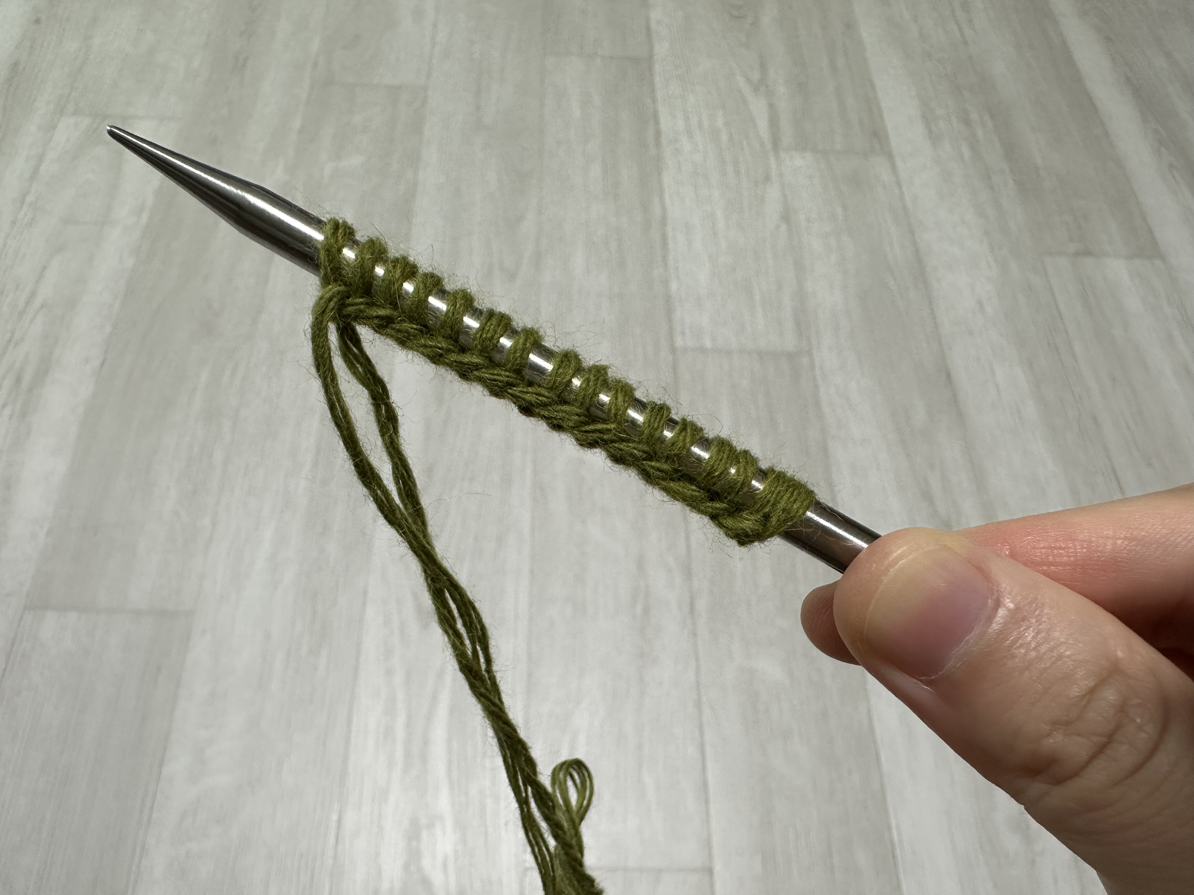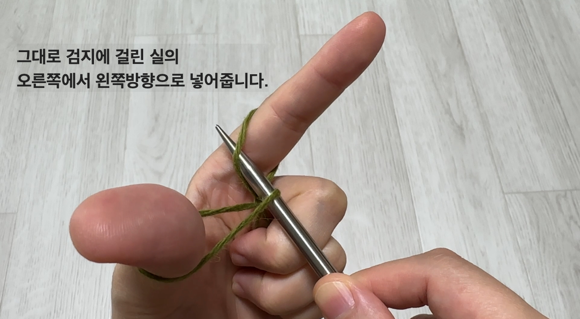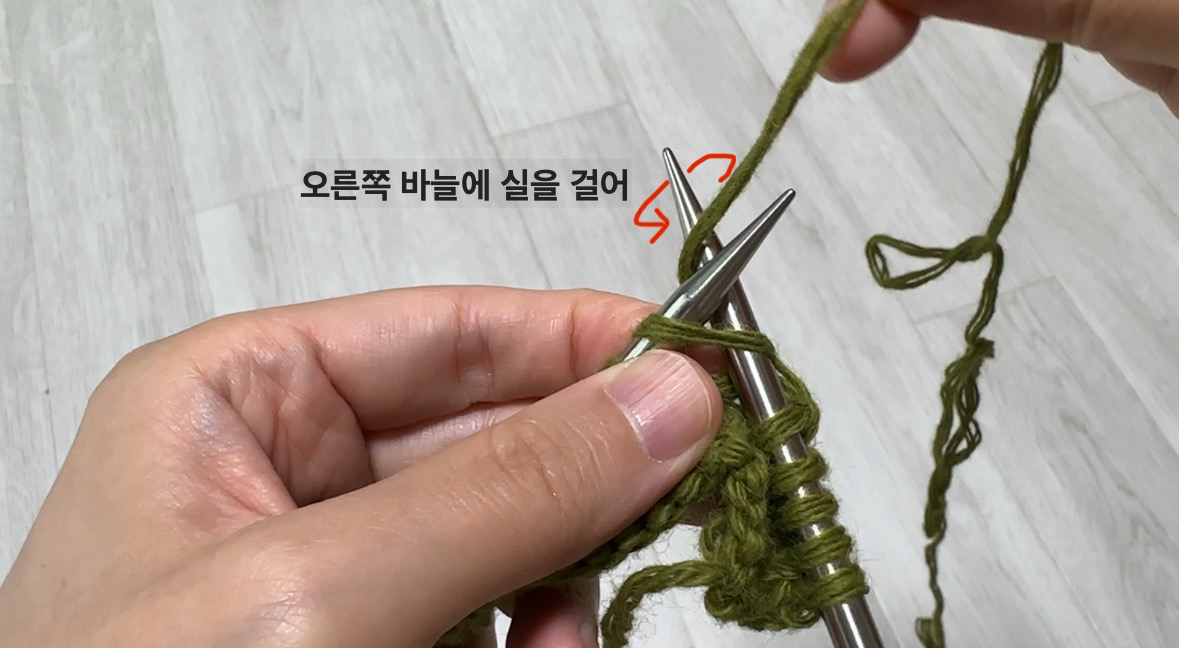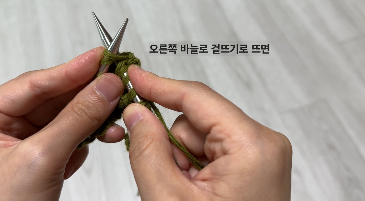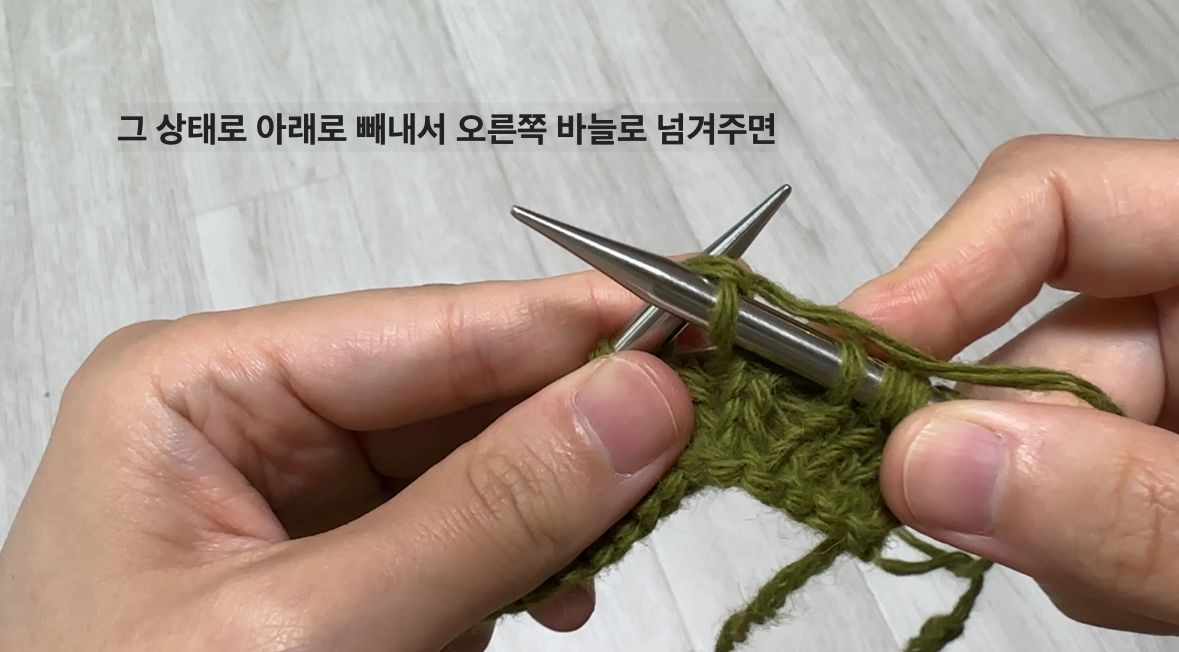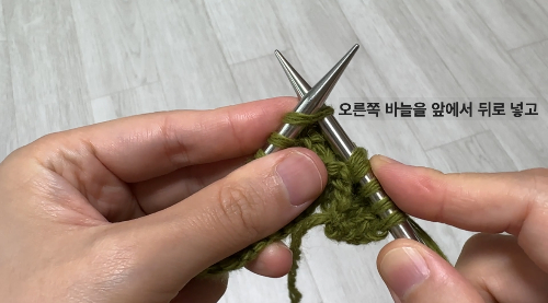 - 방법 : 바늘을 앞에서 뒤로 넣고, 실을 걸어 빼내면 겉뜨기 한 코 완성입니다.