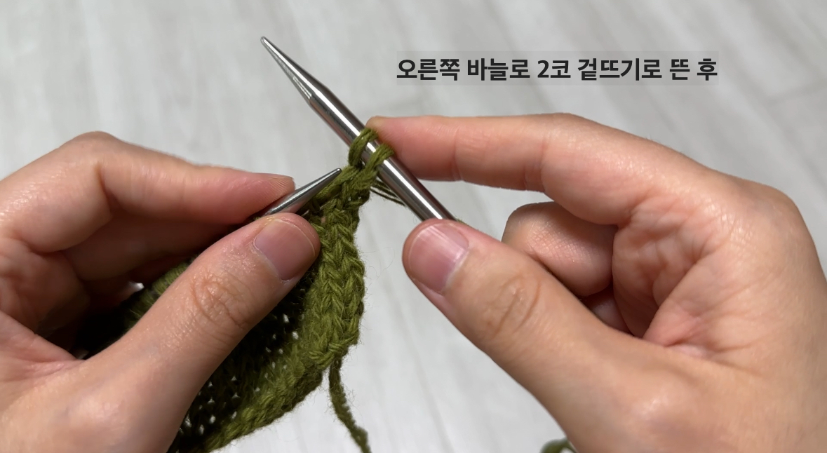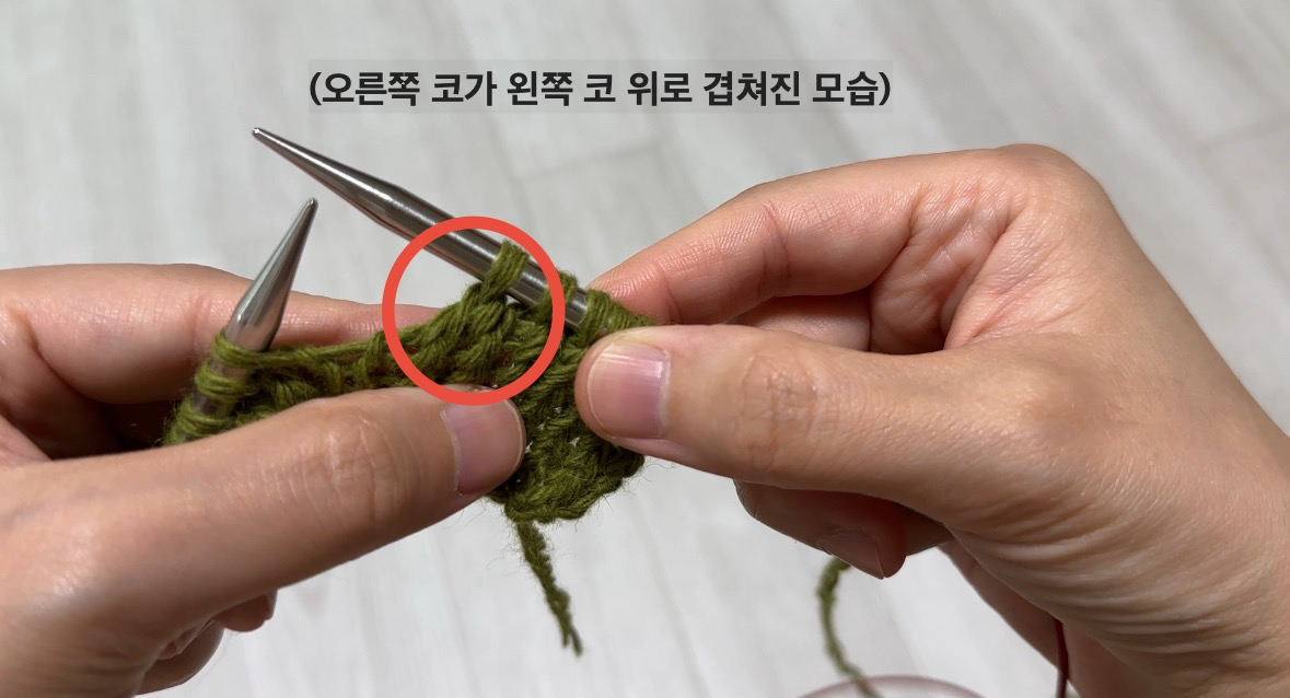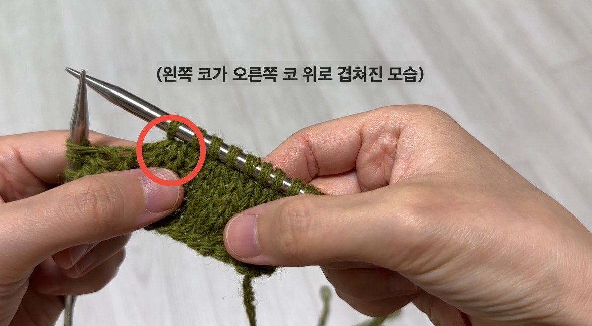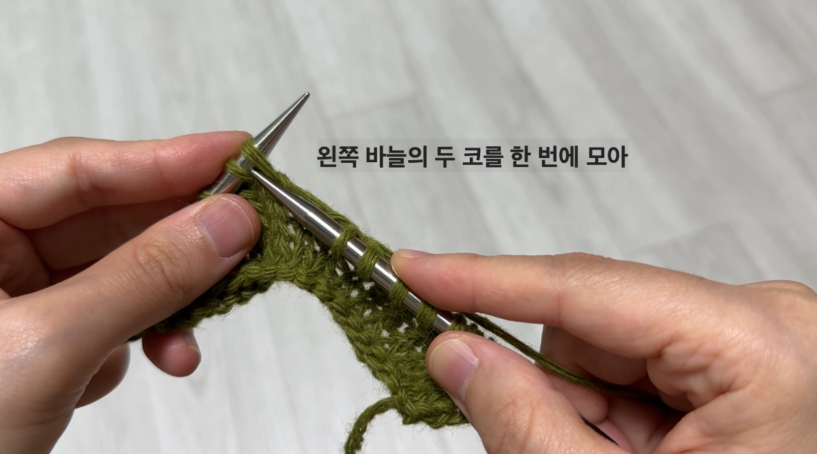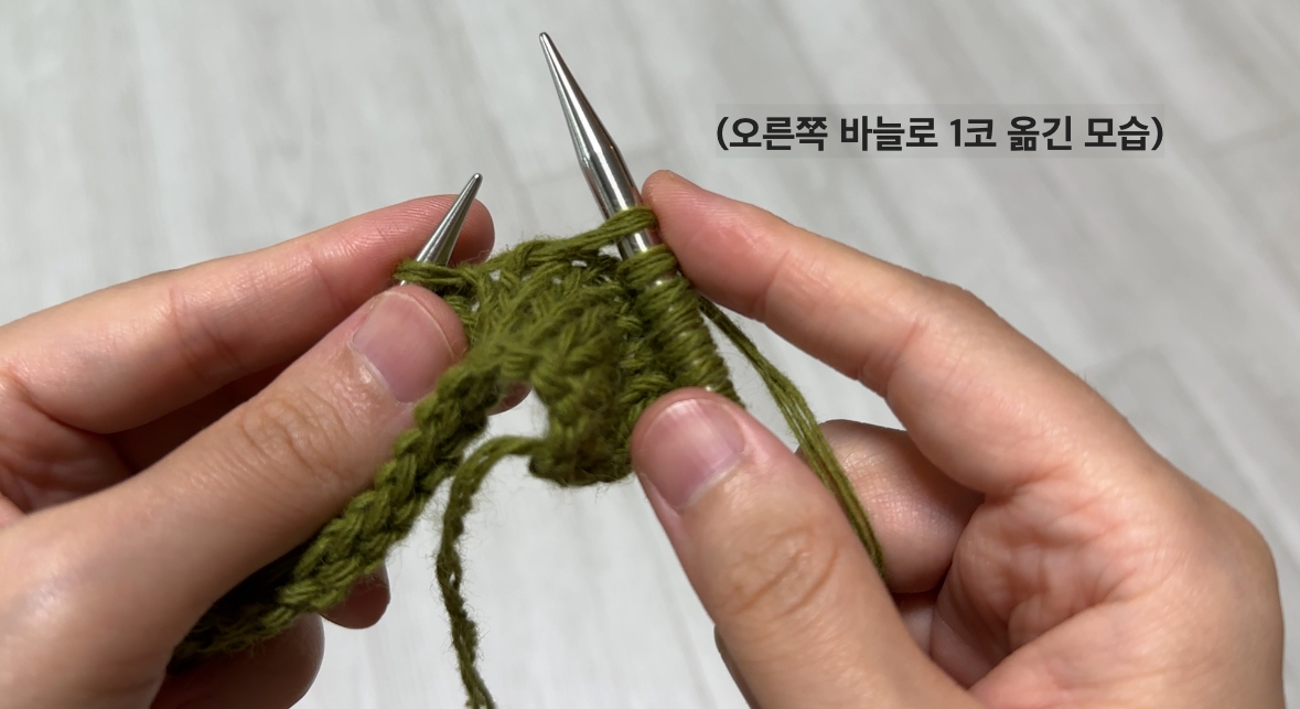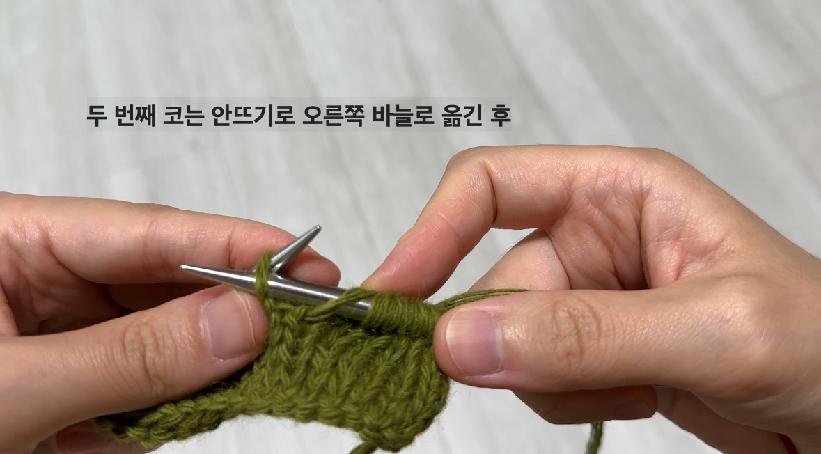 2코를 모두 그대로 옮기는 방법도 있지만, 저는 첫 코는 그대로, 두 번째 코는 안뜨기 방향으로 옮기는 법을 선호해요.