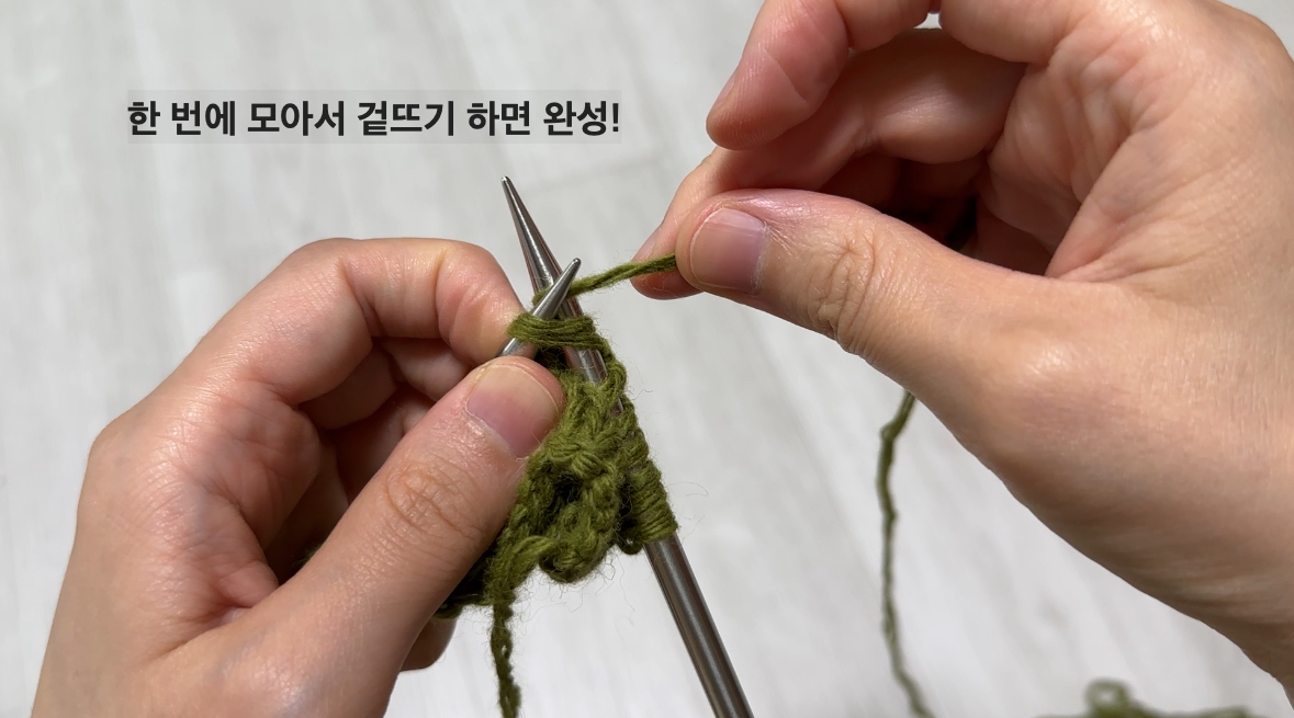 겉뜨기 2코를 한 번에 떠서 코를 줄이는 방법입니다. 삼각형 모양을 만들거나 모양 잡기에 많이 쓰입니다.