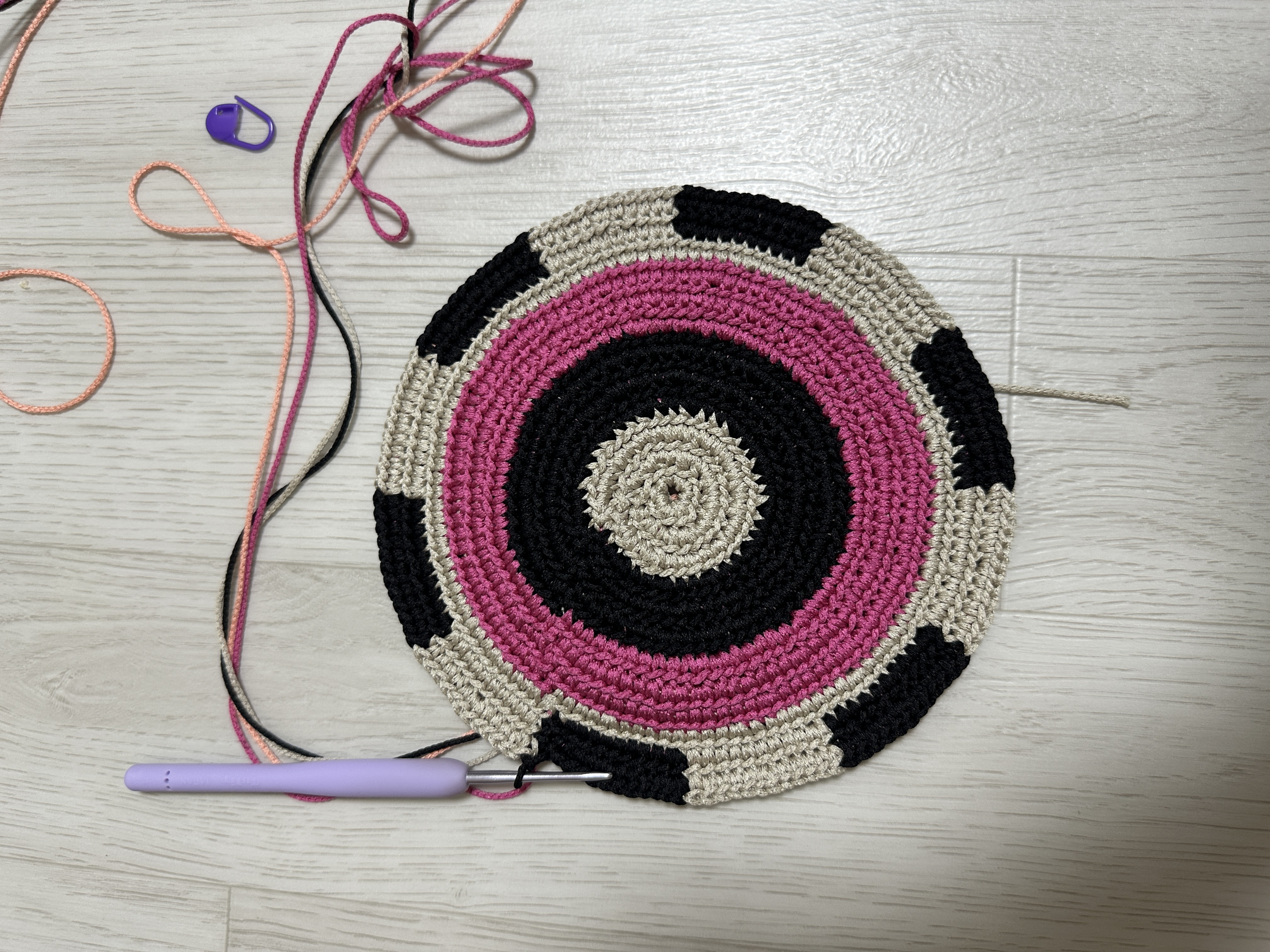 코바늘로 모자와 가방 세트를 처음 떠 보고, 두 번째 작품으로 모칠라 백을 뜨게 되어서
