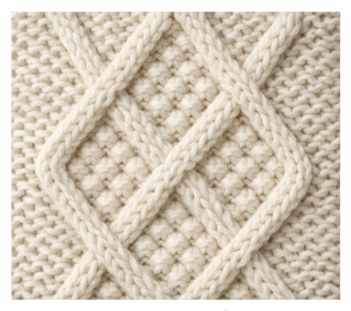 케이블이 꼬이고, 격자와 다이아몬드 무늬가 반복되며, 단순한 편물에 깊이감과 이야기를 더해 주는 것이 특징이에요.