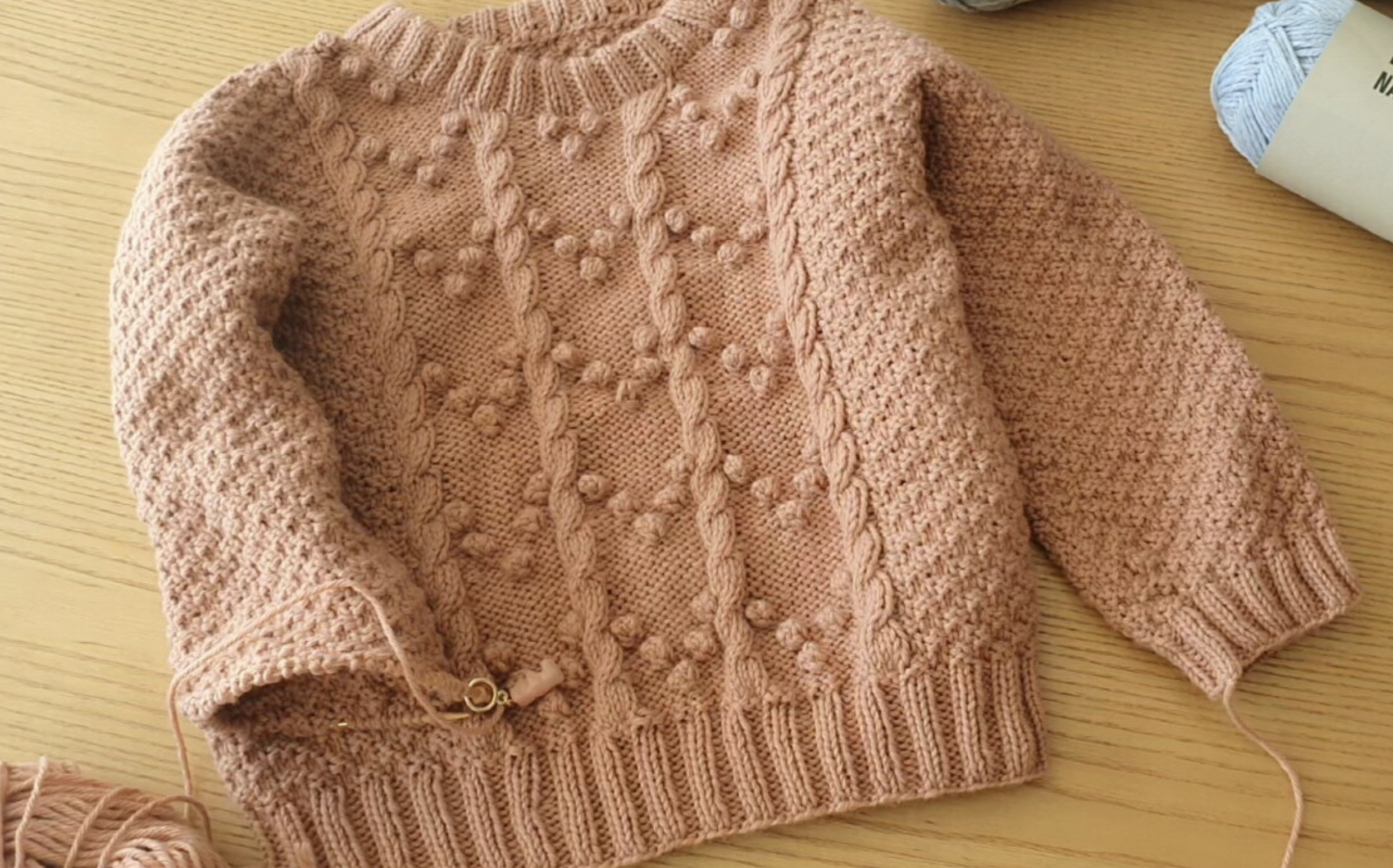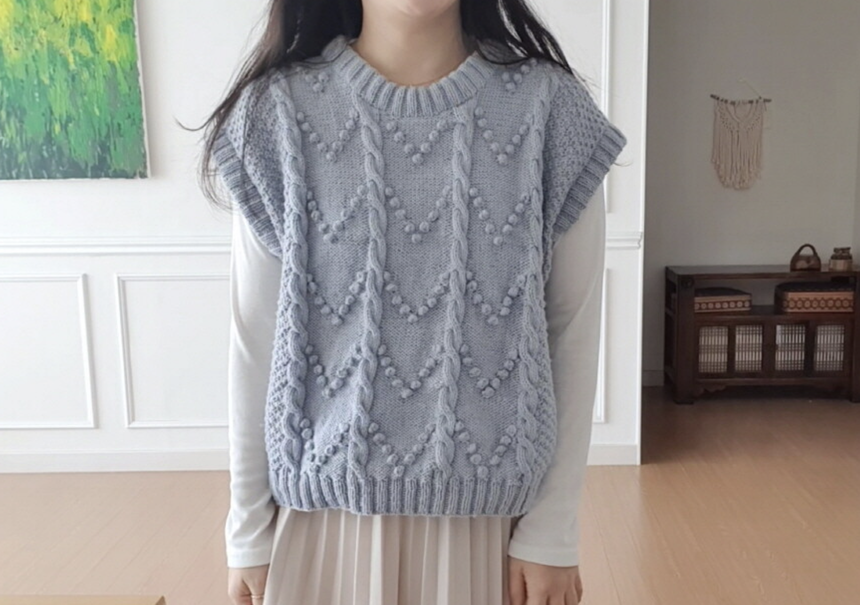몽글몽글한 팝콘 뜨기 기법이 들어가 있어 입었을 때 얼굴이 화사해 보이는 효과가 있어요.