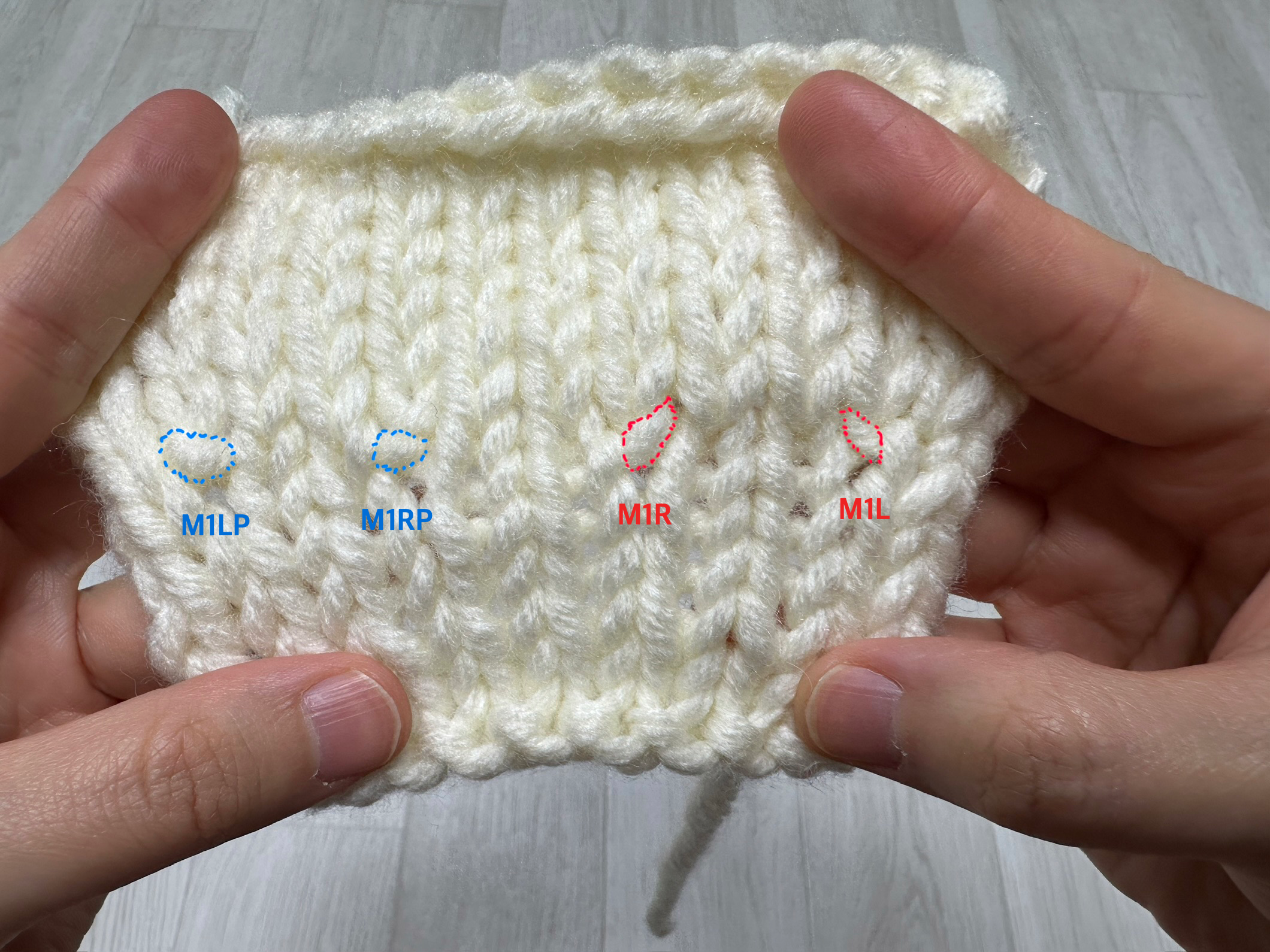 'M1LP(Make One Left Purl)'와 'M1RP(Make One Right Purl)'는 안뜨기 방향에서 사용하는 코 늘림 기법으로,